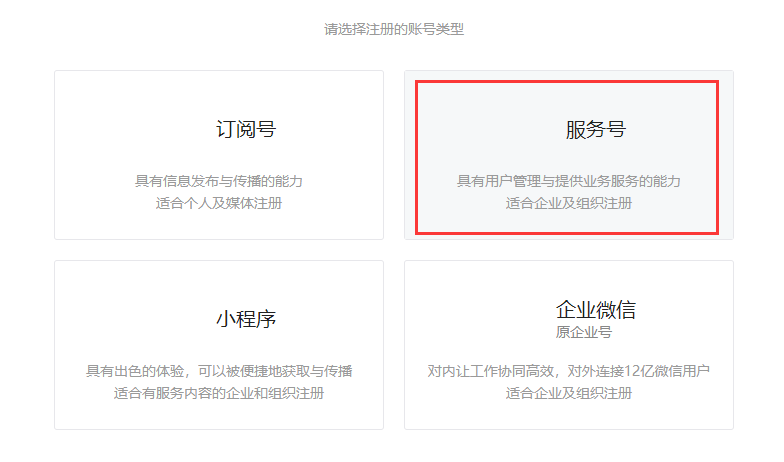 2、選擇公眾號(hào)的注冊(cè)賬號(hào)類型,主要分服務(wù)號(hào)和訂閱號(hào),這里以服務(wù)號(hào)為例