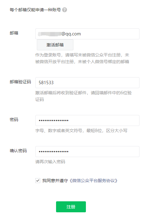 3、用從未注冊(cè)過微信公眾號(hào)的郵箱賬號(hào)來注冊(cè),會(huì)發(fā)送激活碼到郵箱,輸入激活碼和密碼,就能注冊(cè)成功公眾號(hào)