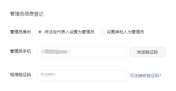 6、管理員信息登記,可以是法人,也可以是法人授權(quán)的管理員,輸入手機(jī)號(hào)碼和驗(yàn)證碼