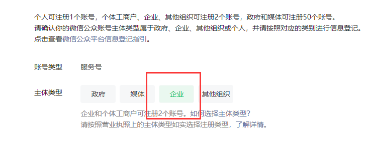 4、選擇賬號(hào)主體類型,政府選擇政府,企業(yè)就選擇企業(yè),這里以企業(yè)為主