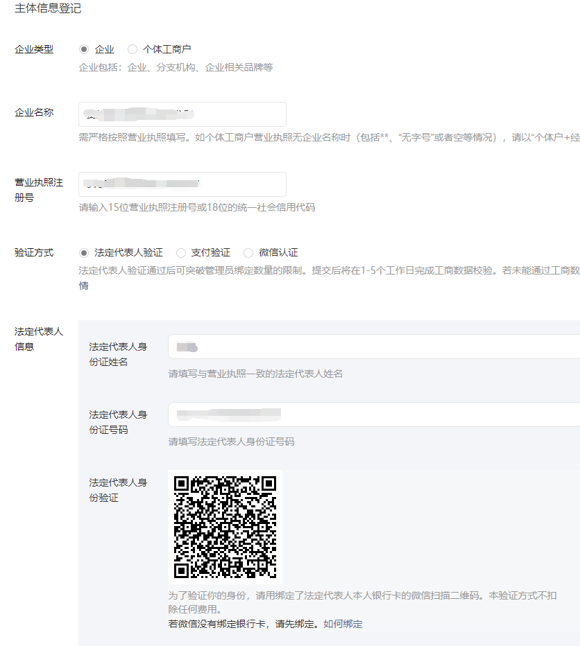5、主體信息登記,按照營(yíng)業(yè)執(zhí)照上的信息來填,公司名稱還有營(yíng)業(yè)執(zhí)照號(hào)碼,然后法人掃碼驗(yàn)證
