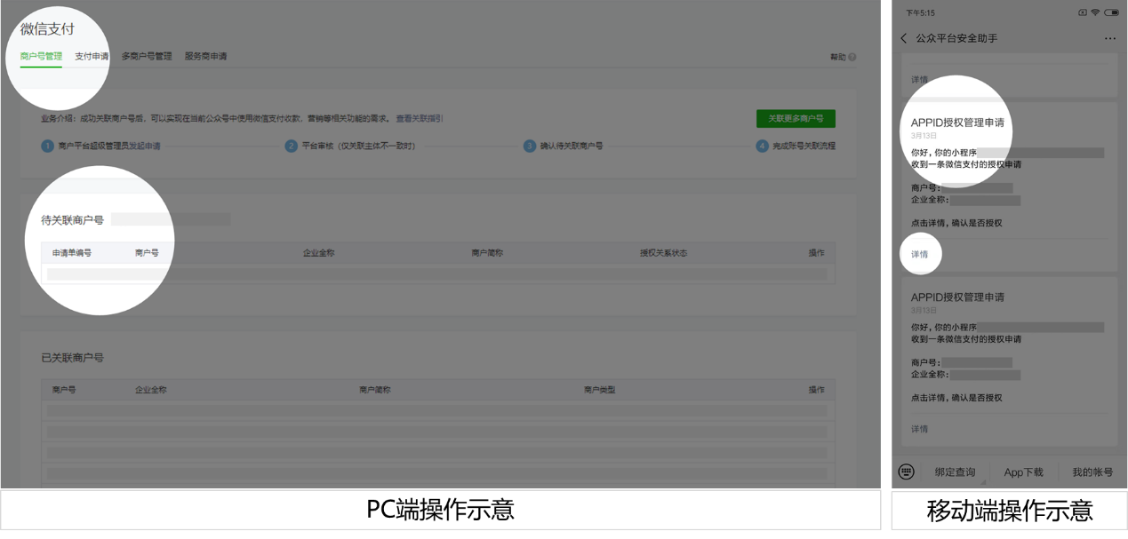 小程序:前往公眾平臺(mp.weixin.qq.com),點擊“微信支付-商戶號管理”,查看相關商戶號信息,確認授權申請;或在“公眾平臺安全助手”下發(fā)的模板消息中確認授權信息;