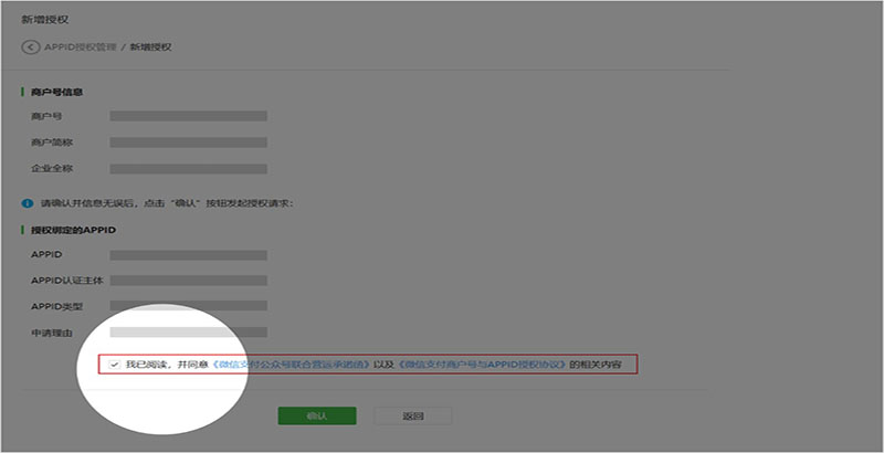 2. 填寫相關已認證APPID信息,閱讀并簽署《微信支付商戶號與APPID授權協(xié)議》,點擊“確認”提交,發(fā)起授權申請;