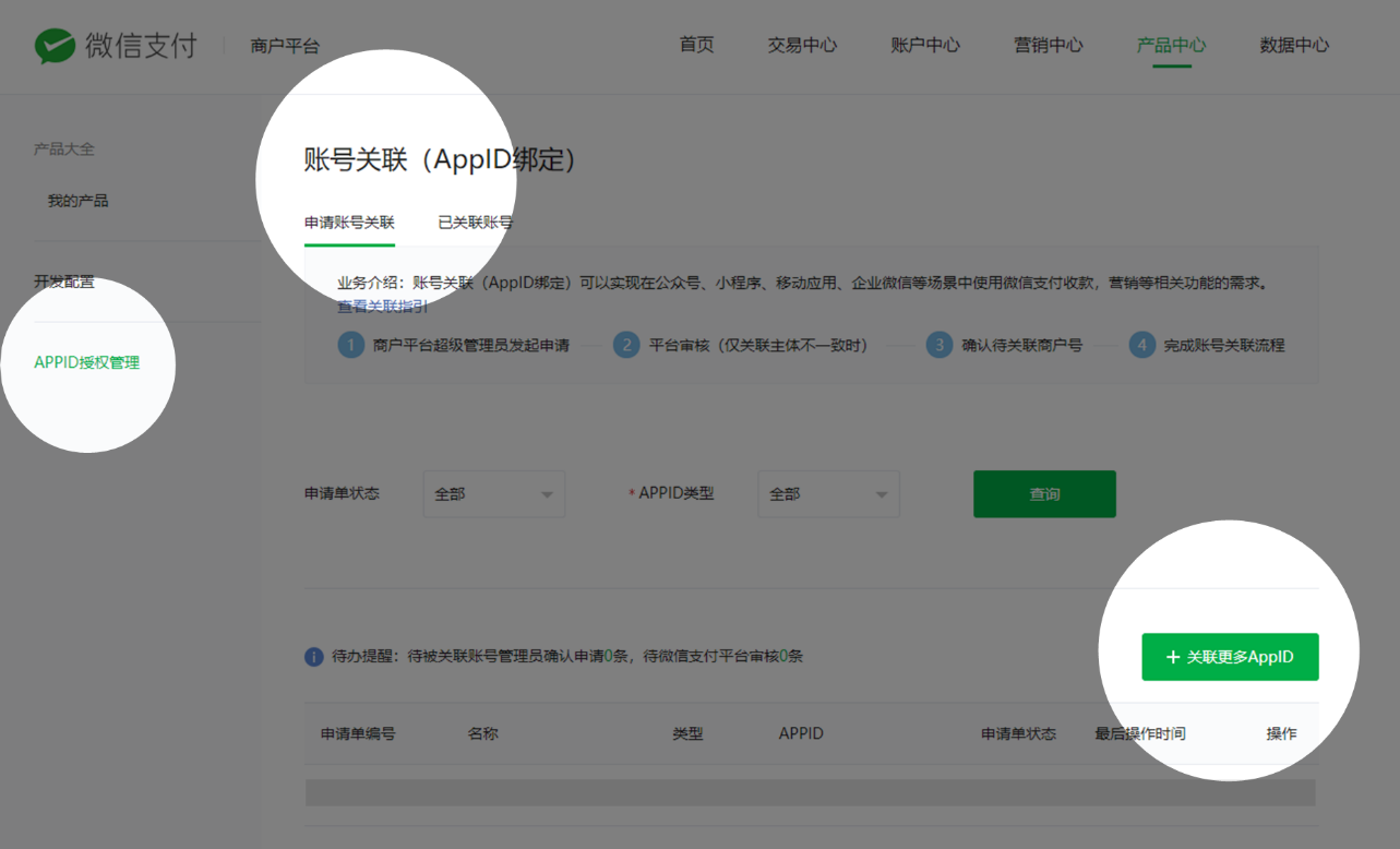 1. 登錄商戶平臺-產品中心-賬號關聯(lián)(AppID綁定),進入授權申請頁面;