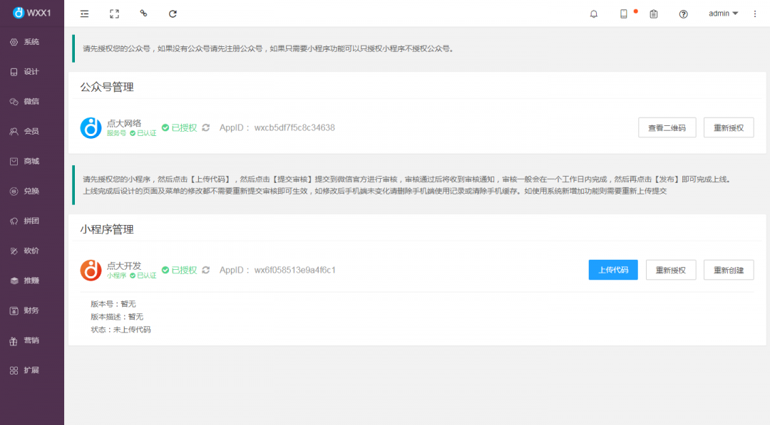 3、授權成功后,即可進行編輯小程序界面,上傳產品等操作